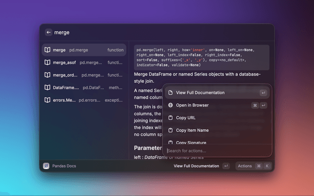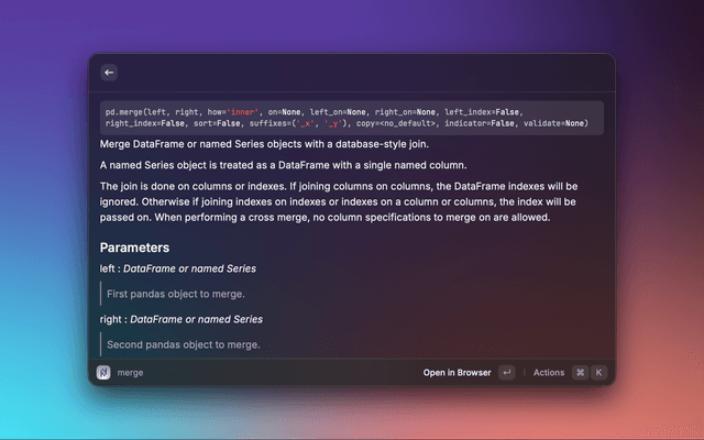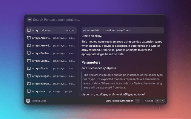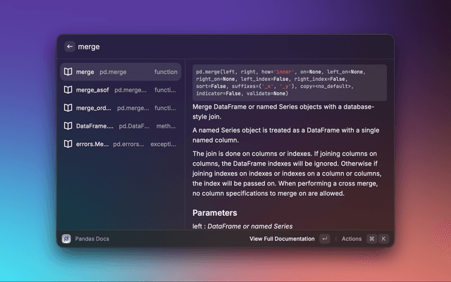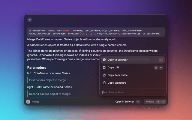 A Raycast extension that lets you search the Pandas API reference and preview detailed documentation without leaving Raycast. Results include signatures, descriptions, parameters, and return values, with quick actions to open the official docs in your browser.