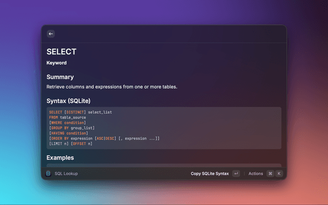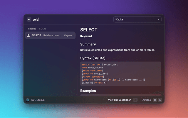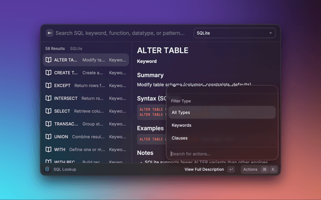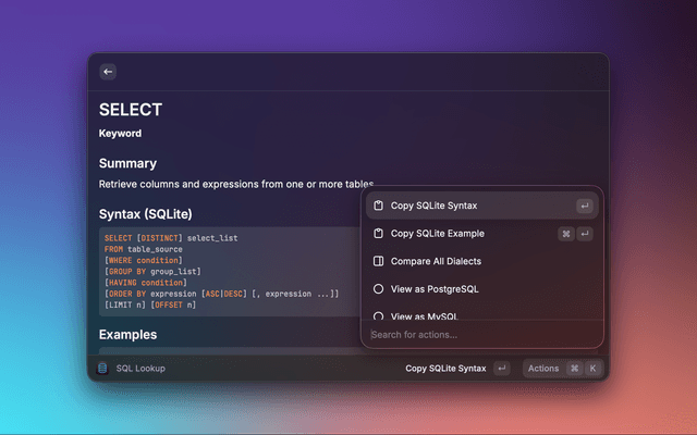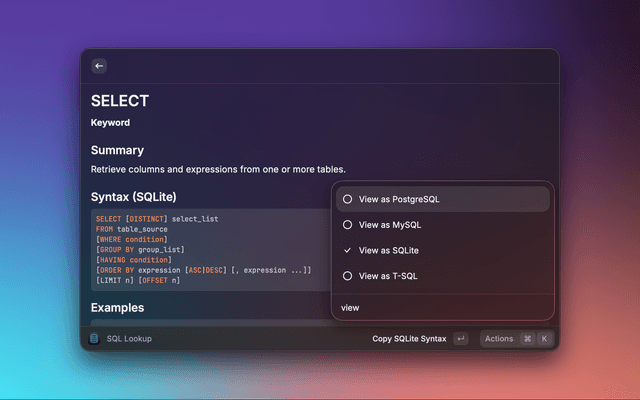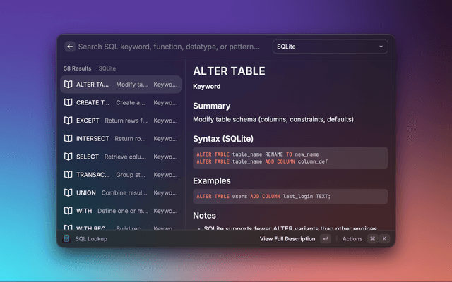 Dialect-aware SQL reference for Raycast with fast offline lookup.