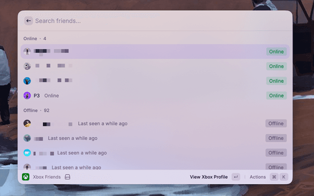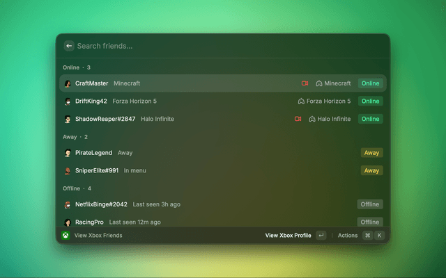 See which Xbox Live friends are online and what they're playing — without leaving Raycast.