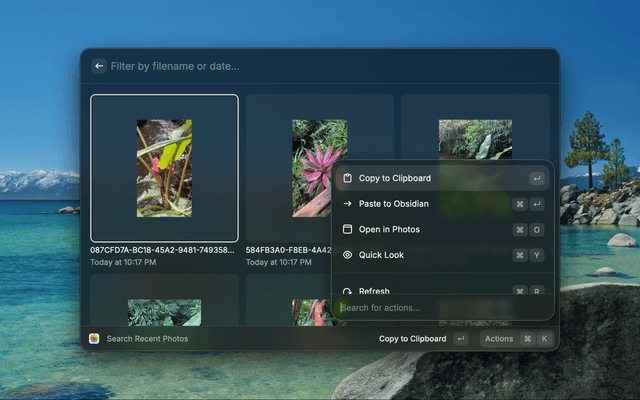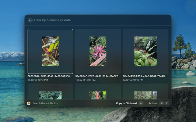 Browse your recent Apple Photos in a grid and paste the latest photo directly into any app.